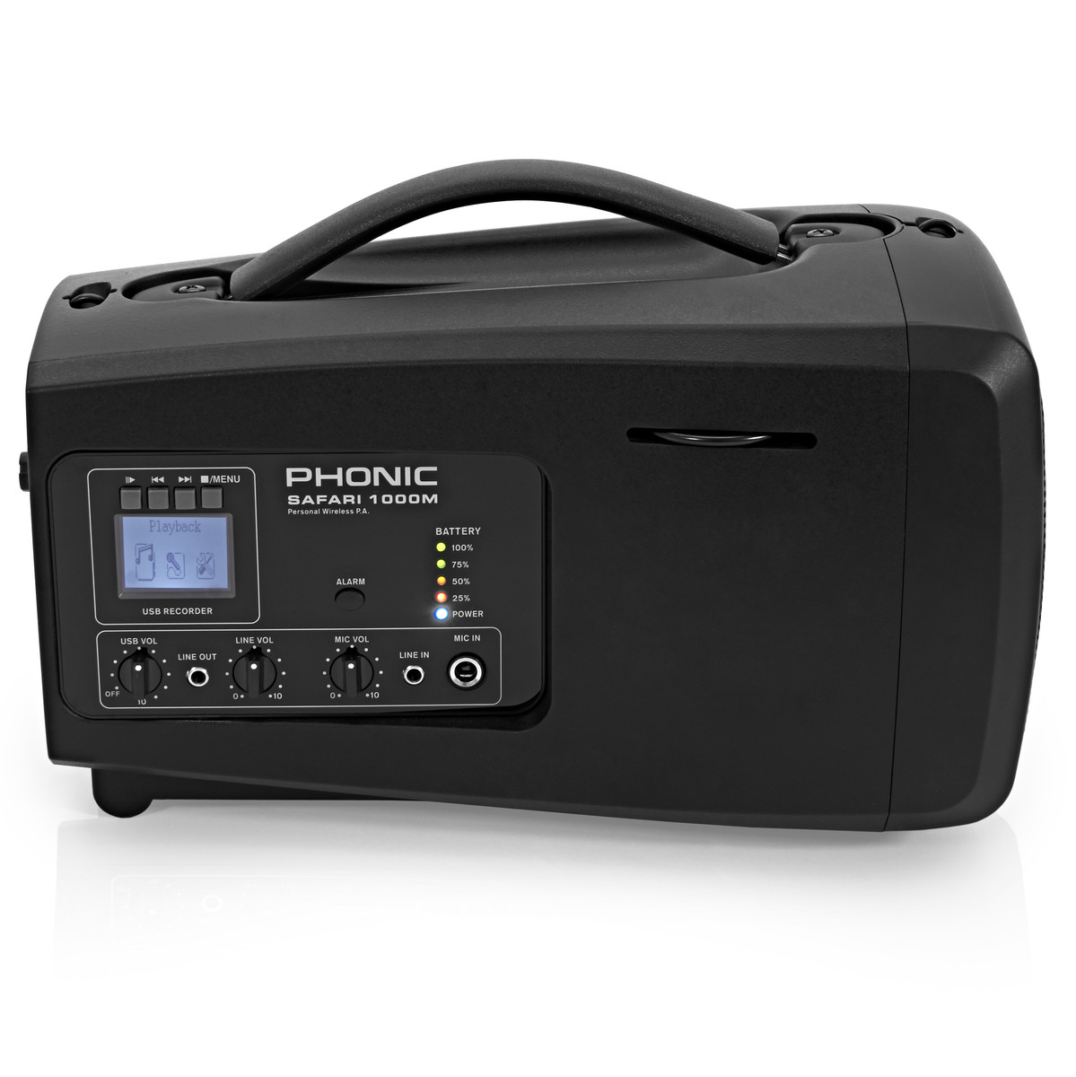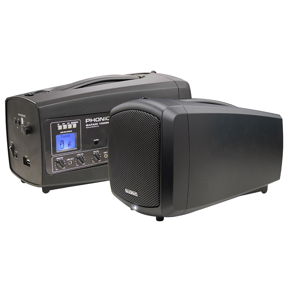 O sistema de PA portátil Phonic Safari 1000M com reprodução USB é um sistema de PA portátil com bateria de lítio. Alimentado por amplificadores avançados de classe D com 50 watts de potência, o Safari 1000M é ideal para pequenas instalações. Com o seu design leve e corpo de polímero robusto, o Safari 1000M possui estilo para portabilidade. Esta versão expandida do Safari 1000 Lite possui tecnologia sem fio para kits de microfone, além de reprodução USB para ler arquivos WAV e MP3 junto com a gravação de arquivos WAV. O sistema de bateria dentro da unidade pode operar 10 horas quando estiver funcionando com capacidade de 80. Também está incluída com a unidade uma bolsa impermeável e alça para maior mobilidade e conveniência.